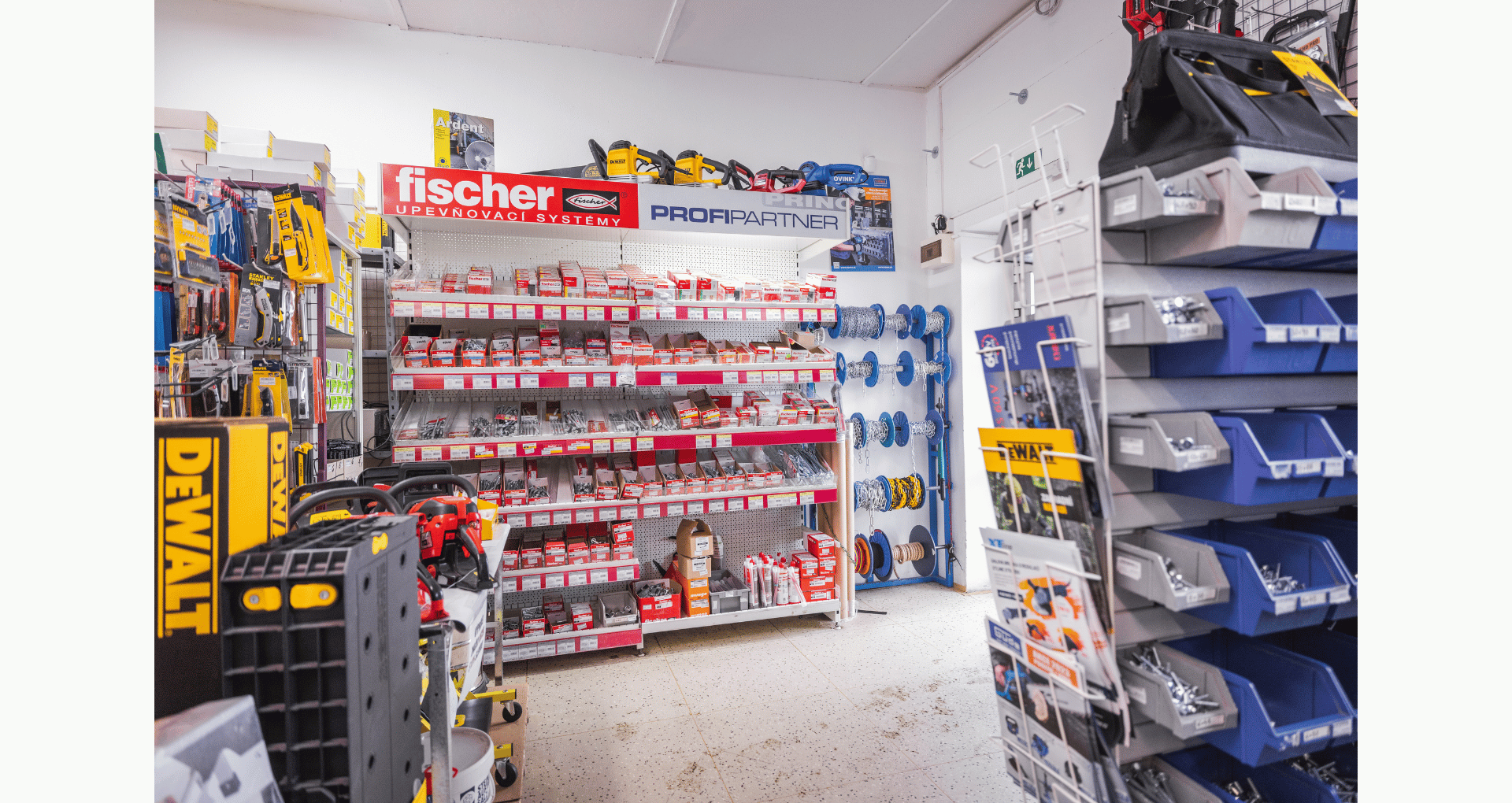 V naší pelhřimovské prodejně i na e-shopu nabízíme kvalitní produkty známých značek (např. DeWALT, RAPI-TEC, Fischer a další).